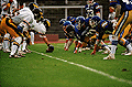 | | Los deportes que le permiten permanecer tan cerca como es posible de la acción (los ejercicios en el piso) obtienen lo mejor de la exposición con zoom más el flash: Si bien el centro de la imagen se encuentra pleno de contraste y con un color neutral, hacia los márgenes donde el flash no alcanza a iluminar, los colores de los objetos más distantes comienzan a desvanecerse. Las fotografías que se toman dentro de clubes deportivos con iluminación permanente ofrecen múltiples oportunidades para el juego fascinante de colores. |